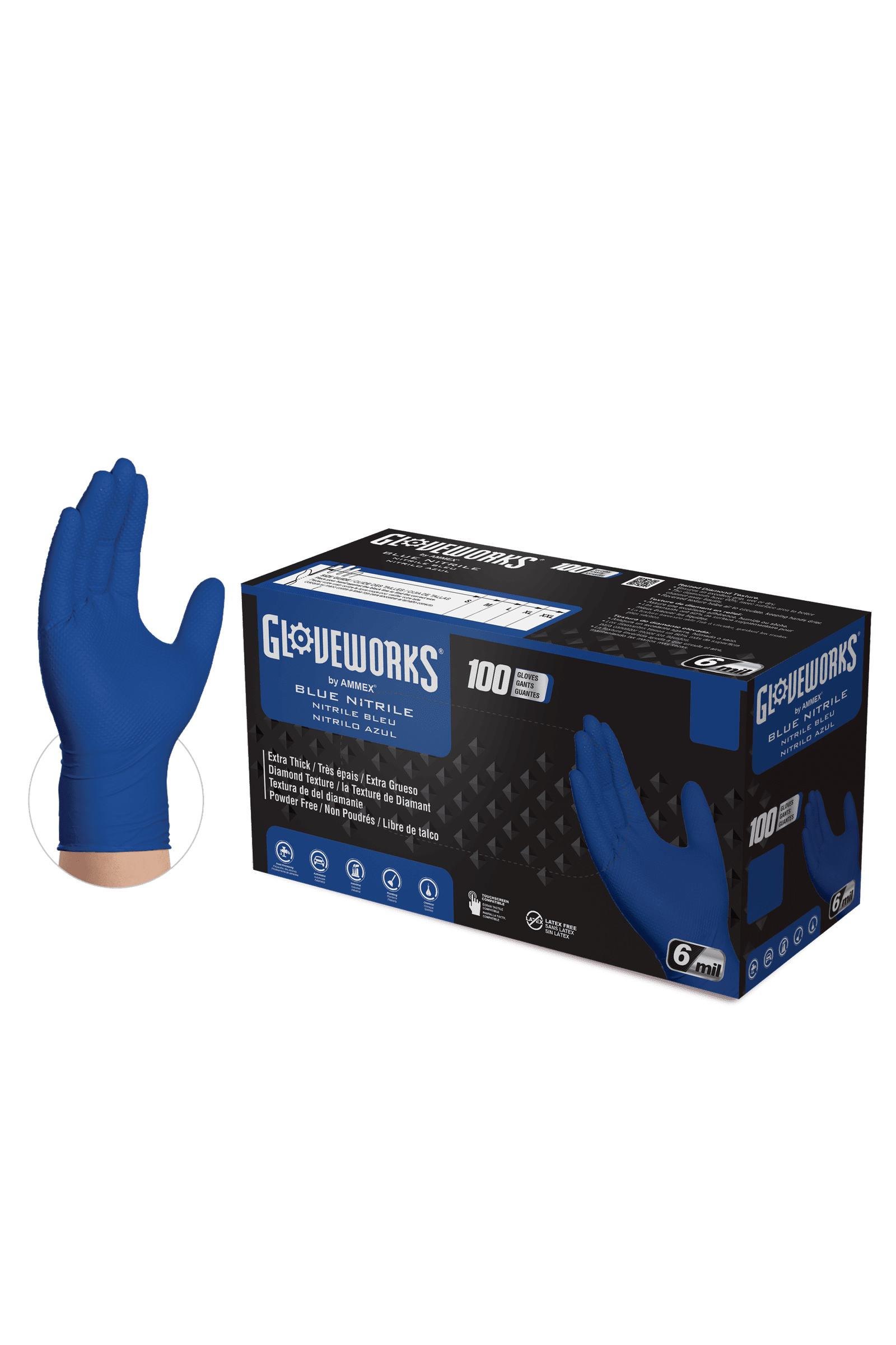 Gloveworks® Industrial Royal Blue Raised Diamond Texture Nitrile Gloves stand up to the toughest jobs. They feature Raised Diamond Texture (RDT), which creates 60% more surface area for an exceptional liquid-channeling grip. RDT provides a comfortable fit: fewer contact points with the skin increase airflow and reduce sweating vs. non-textured gloves.